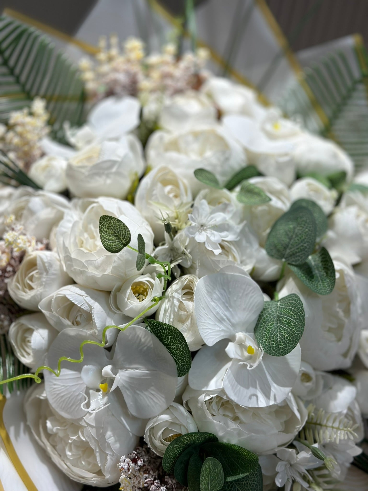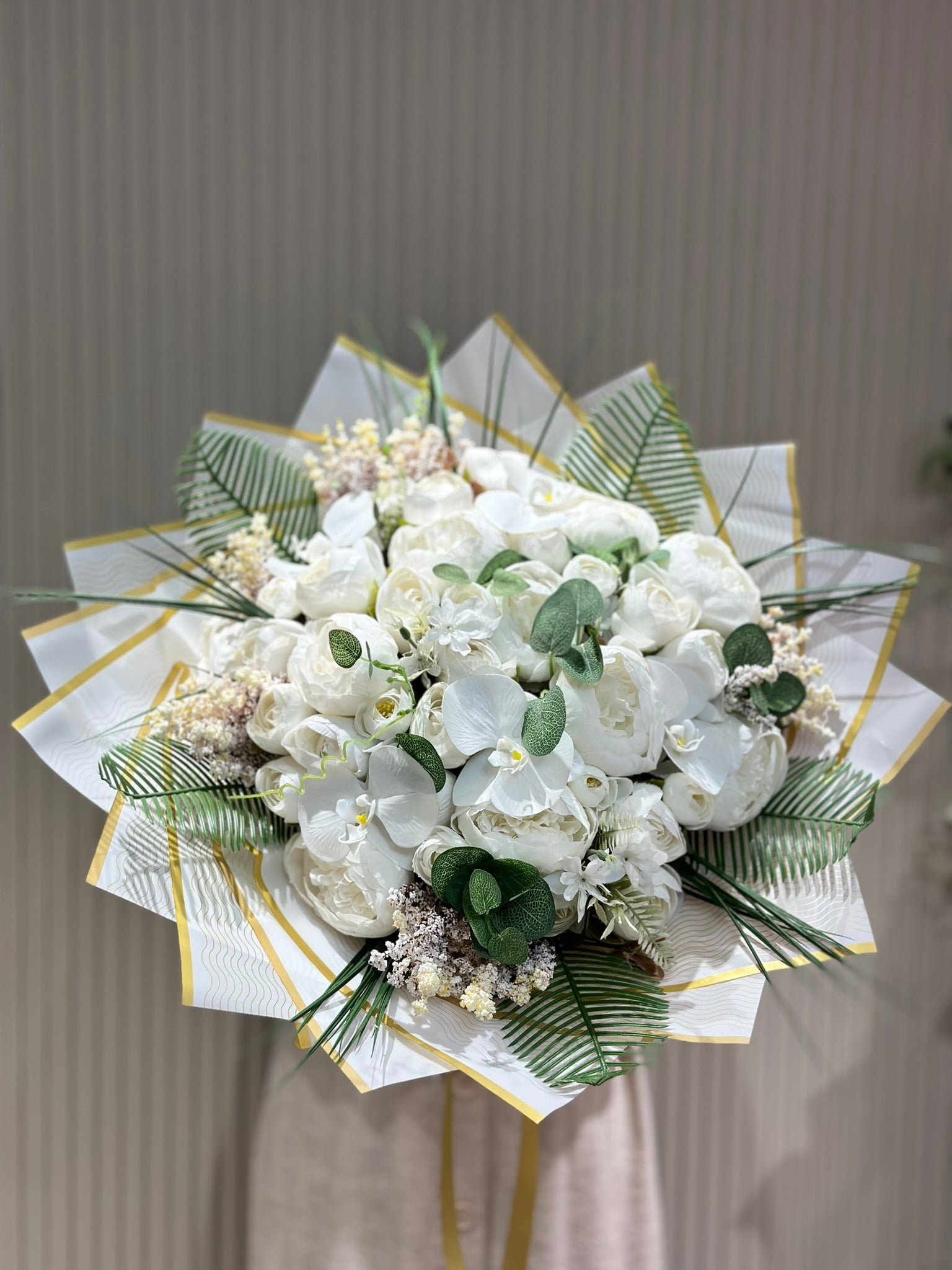Beyaz Gül, Orkide ve Şakayık Buketi – Lüks ve Zarif Tasarım