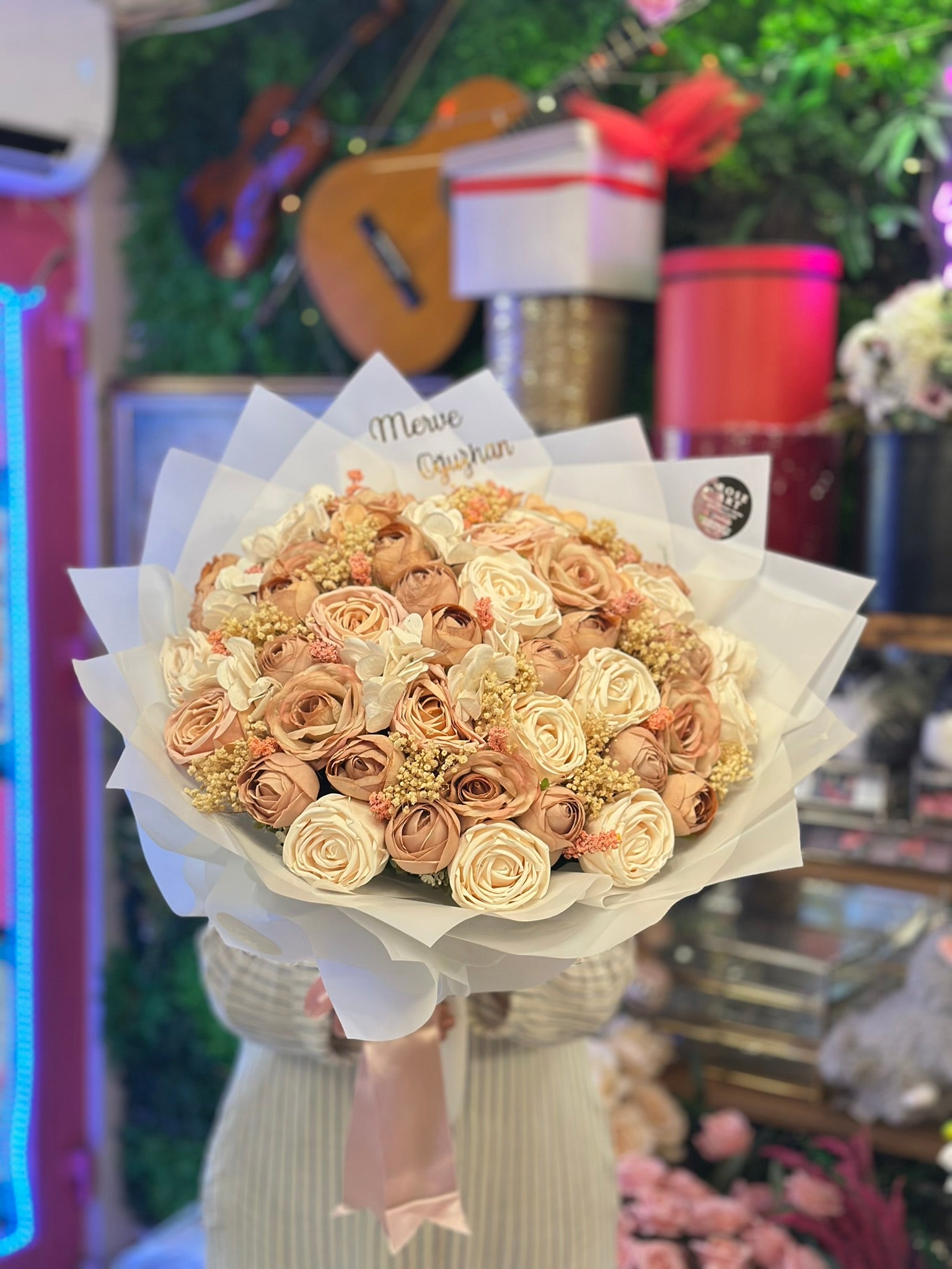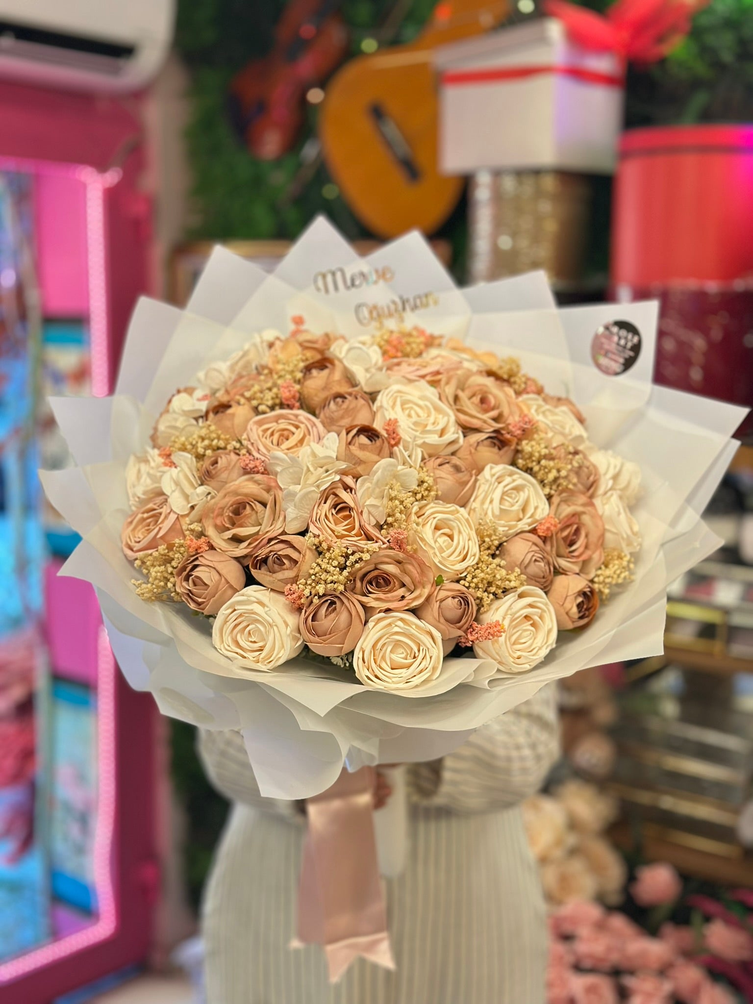 Romantizmin ve zarafetin en yumuşak tonlarıyla hazırlanmış bu pembe-krem sabun gül buketi, özel günlerinize kalıcılık ve zarafet katmak için tasarlandı.