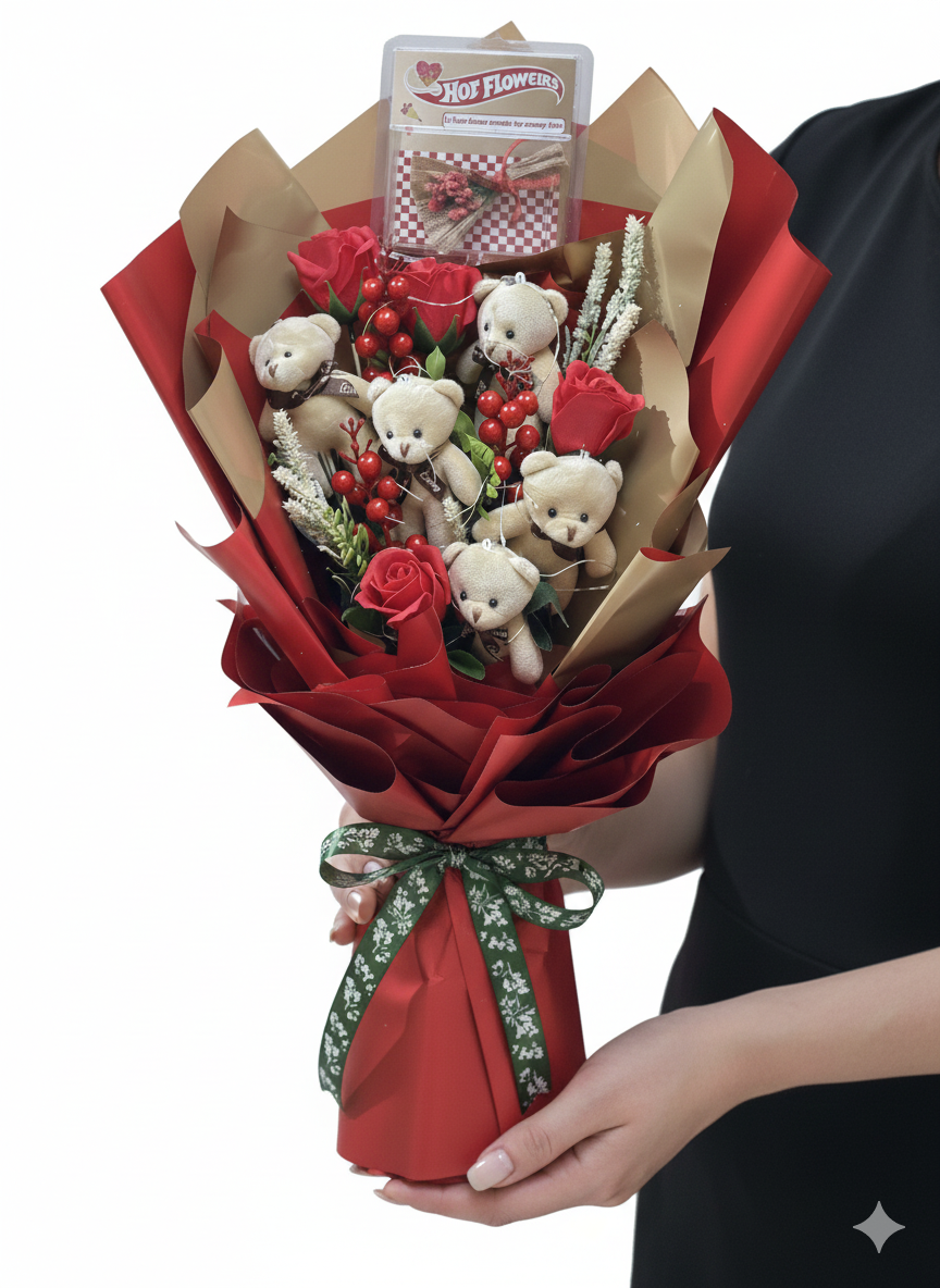 💕 Ayıcıklı & Kırmızı Gül Buketi