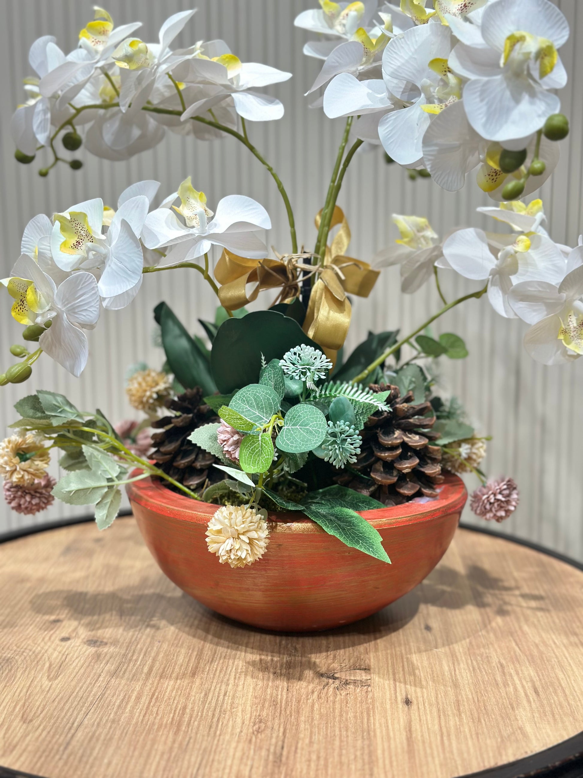 • 5 beyaz orkide dalı, yeşil yaprak ve kozalak detayları içerir.