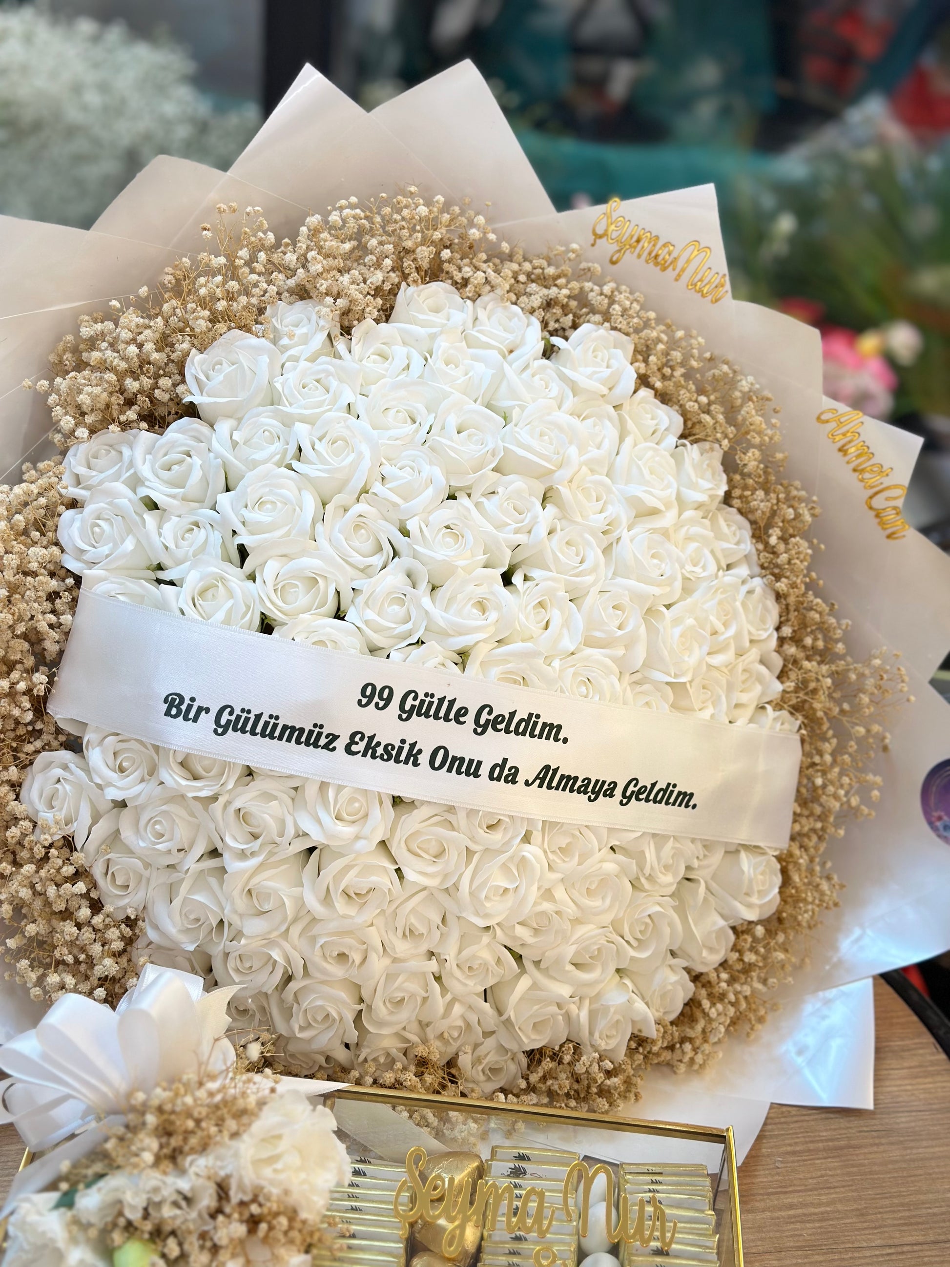 • 99 adet premium beyaz gül ile hazırlanmıştır 🌹
