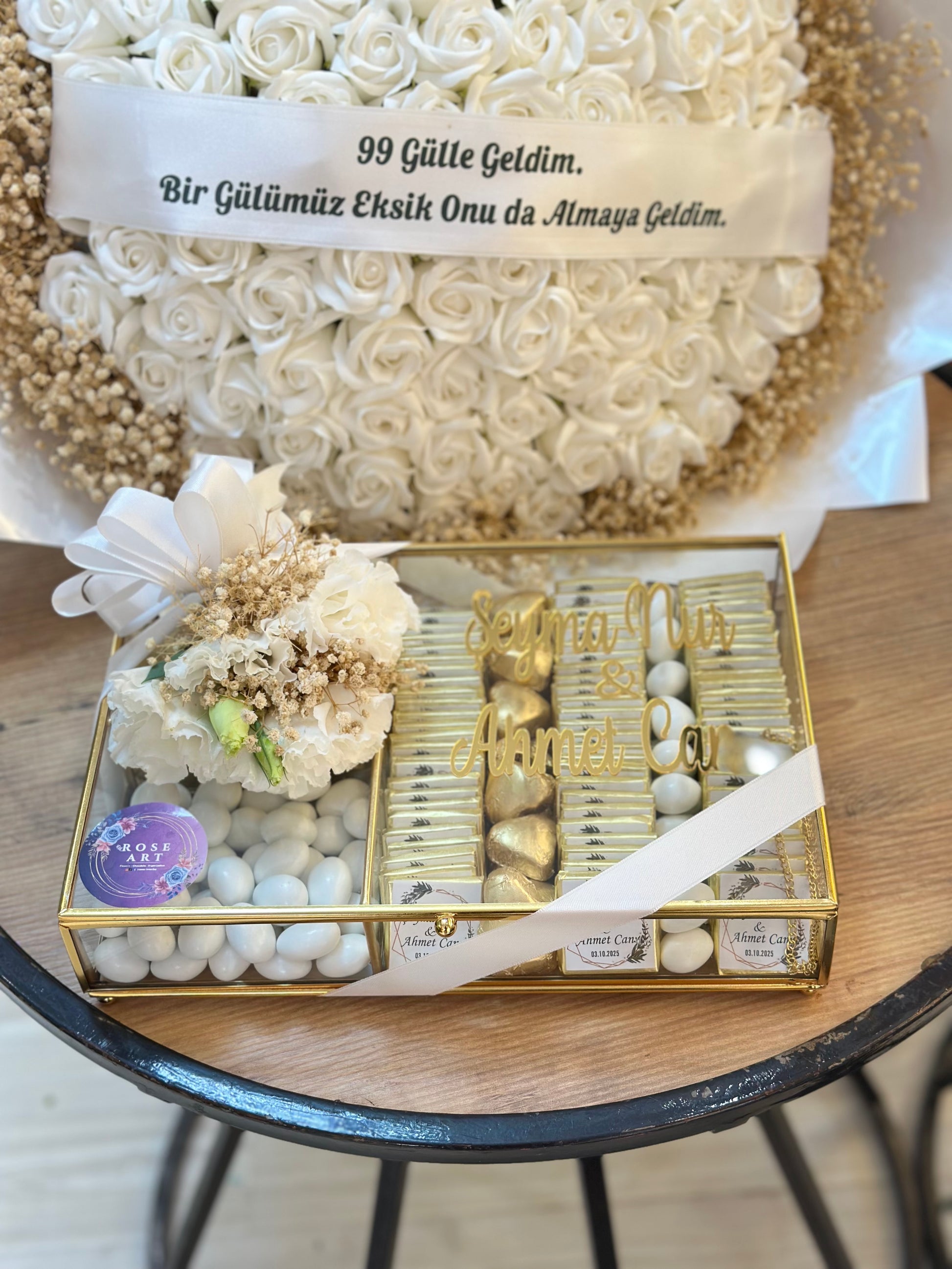 99 Beyaz Gül Aranjmanı & Çikolata Seti