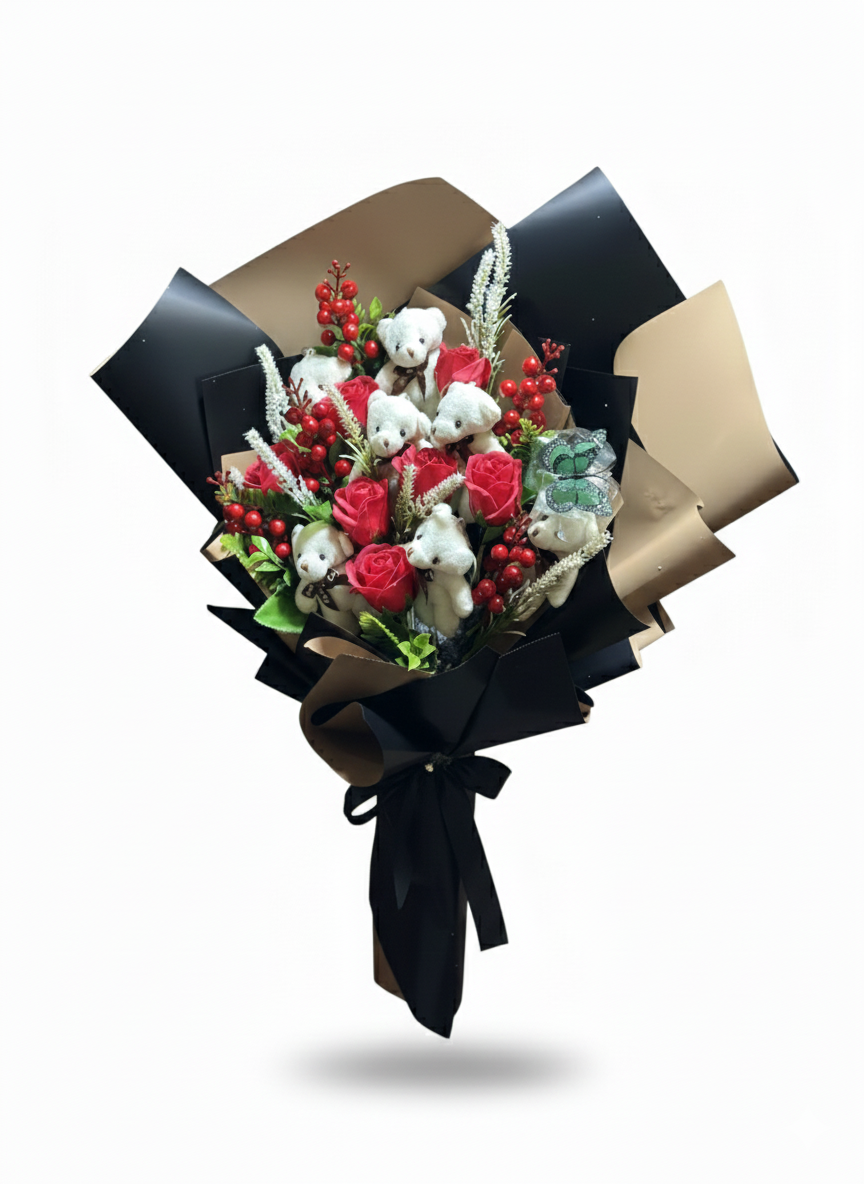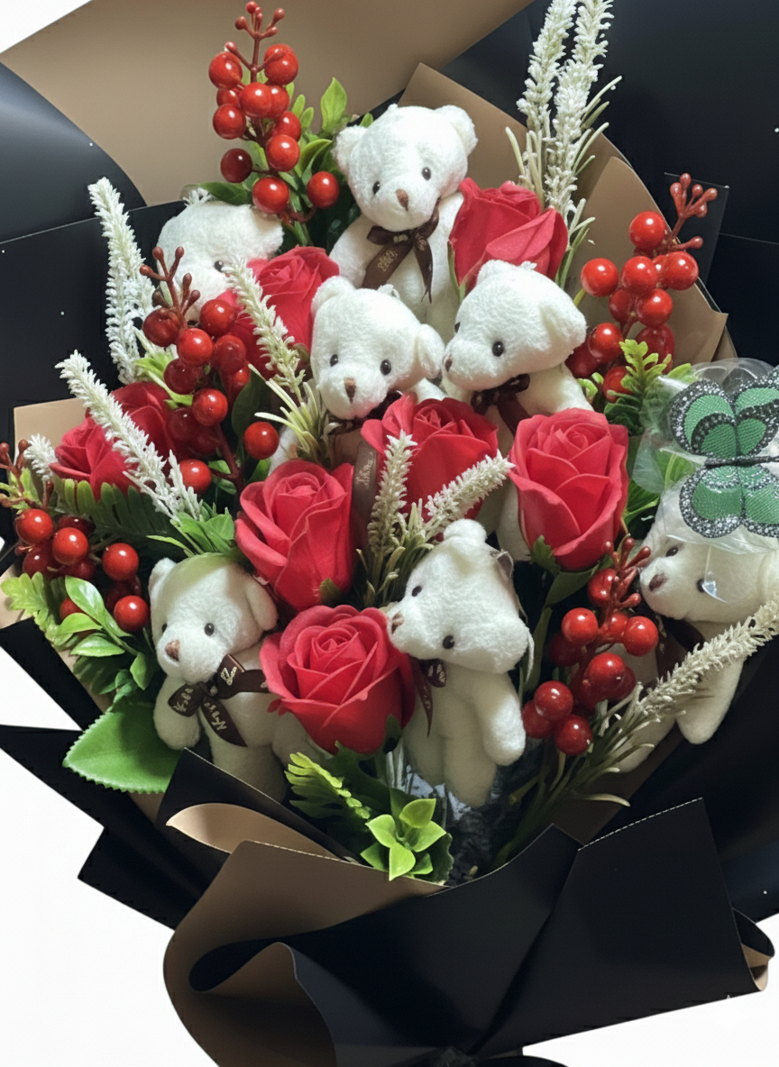 Ayıcıklı & Kırmızı Gül Özel Tasarım Buketi – Premium Seri