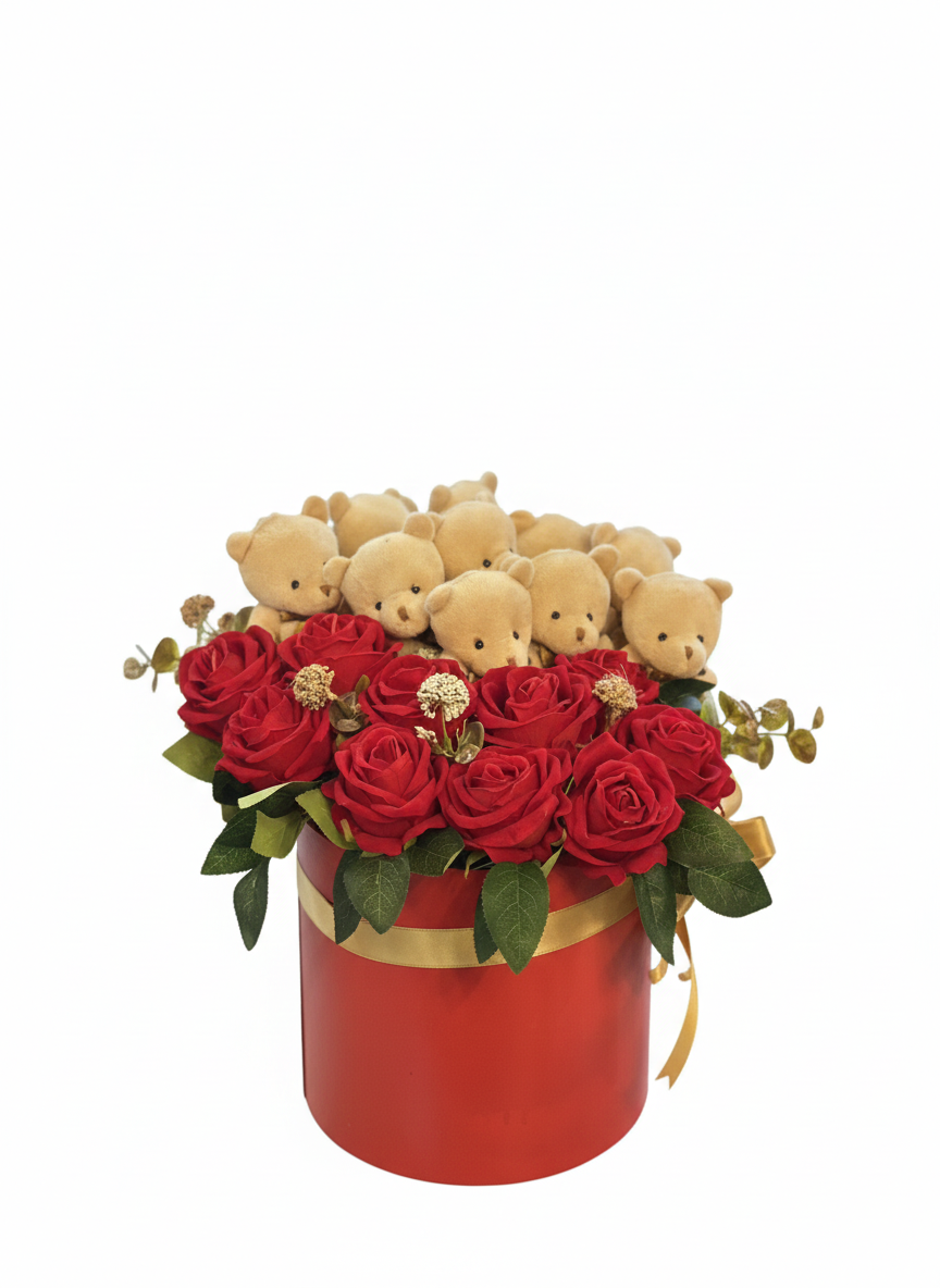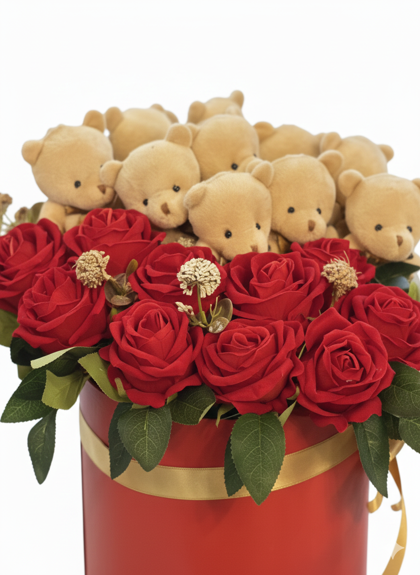 • Kırmızı güller, aşkı ve tutkuyu temsil ederken; ayıcıklar hediyeye samimi ve duygusal bir dokunuş katar.