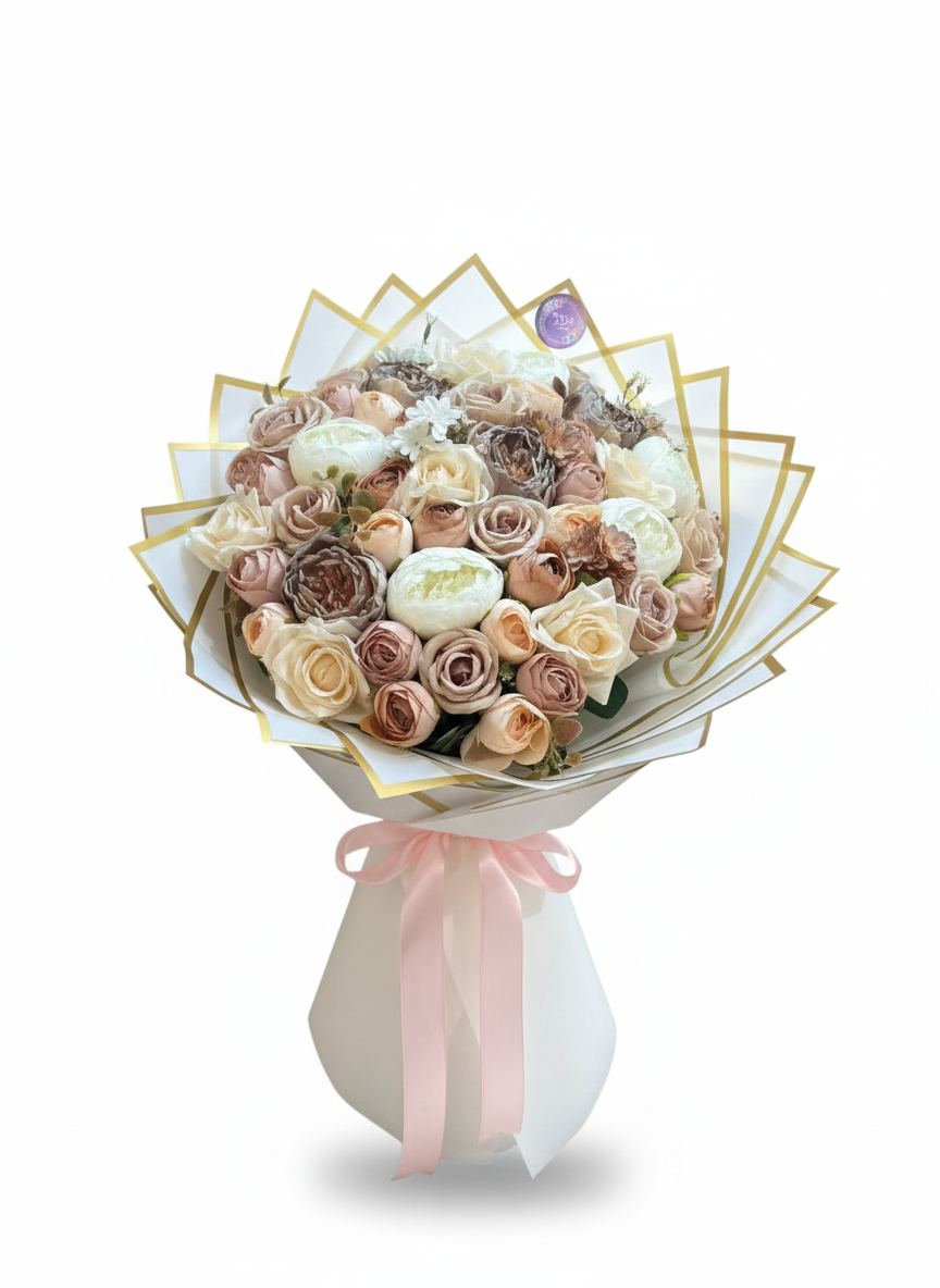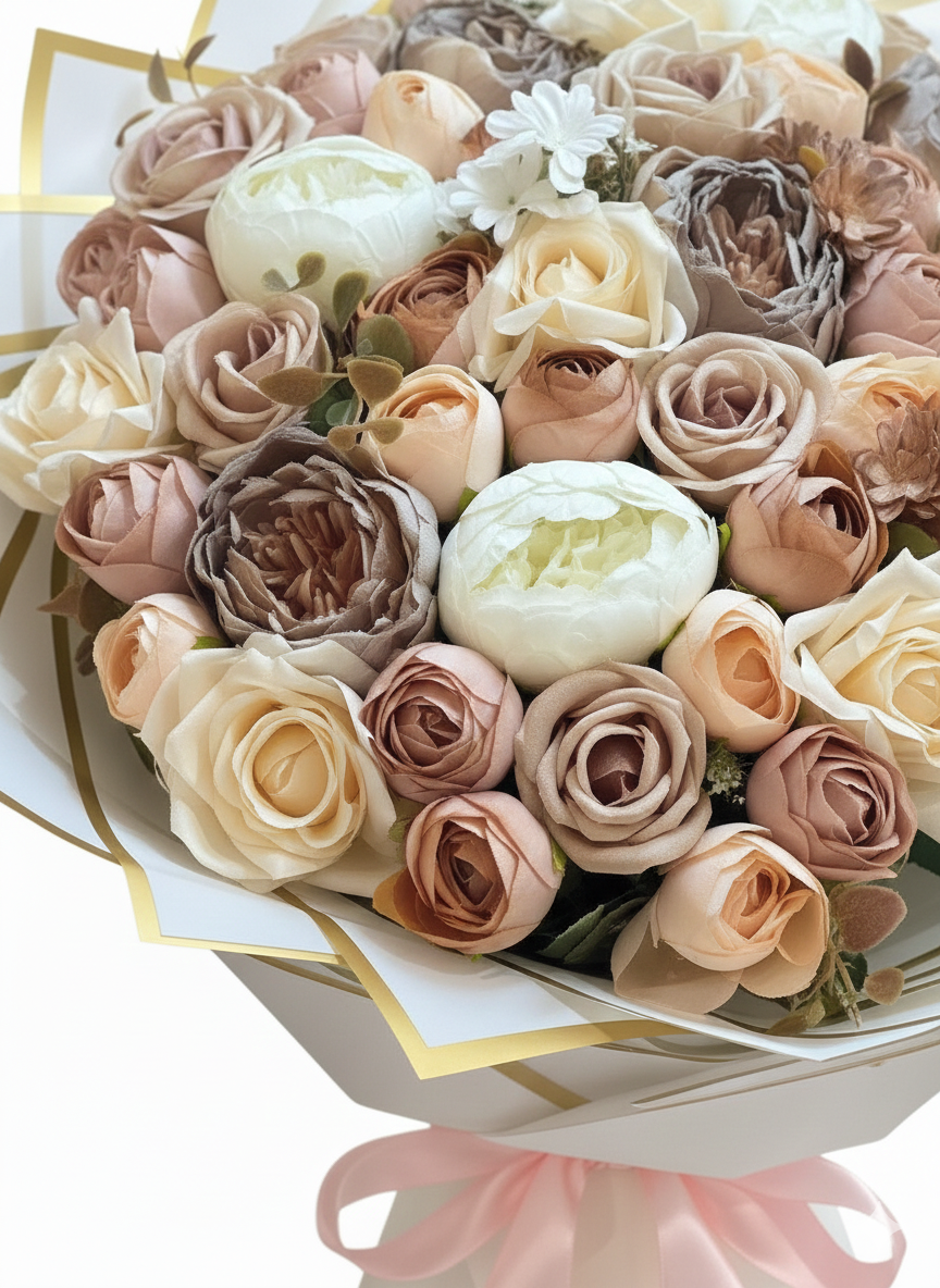 Krem, kahve ve şampanya tonlarının doğal uyumuyla hazırlanan bu özel tasarım, ilk bakışta sıcaklık ve zarafeti aynı anda hissettirir. Renk geçişlerindeki denge, buketi sadece şık değil; güçlü ve iddialı bir duruşa sahip hale getirir.