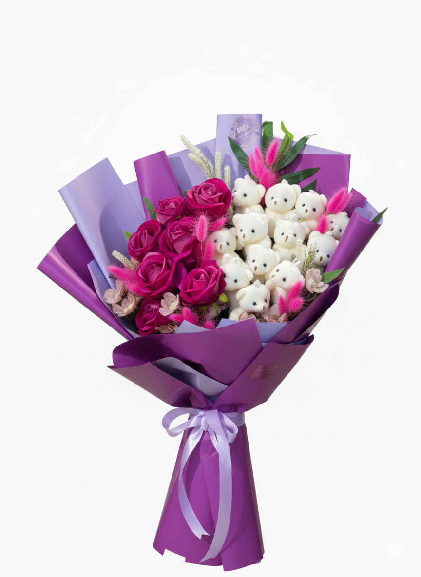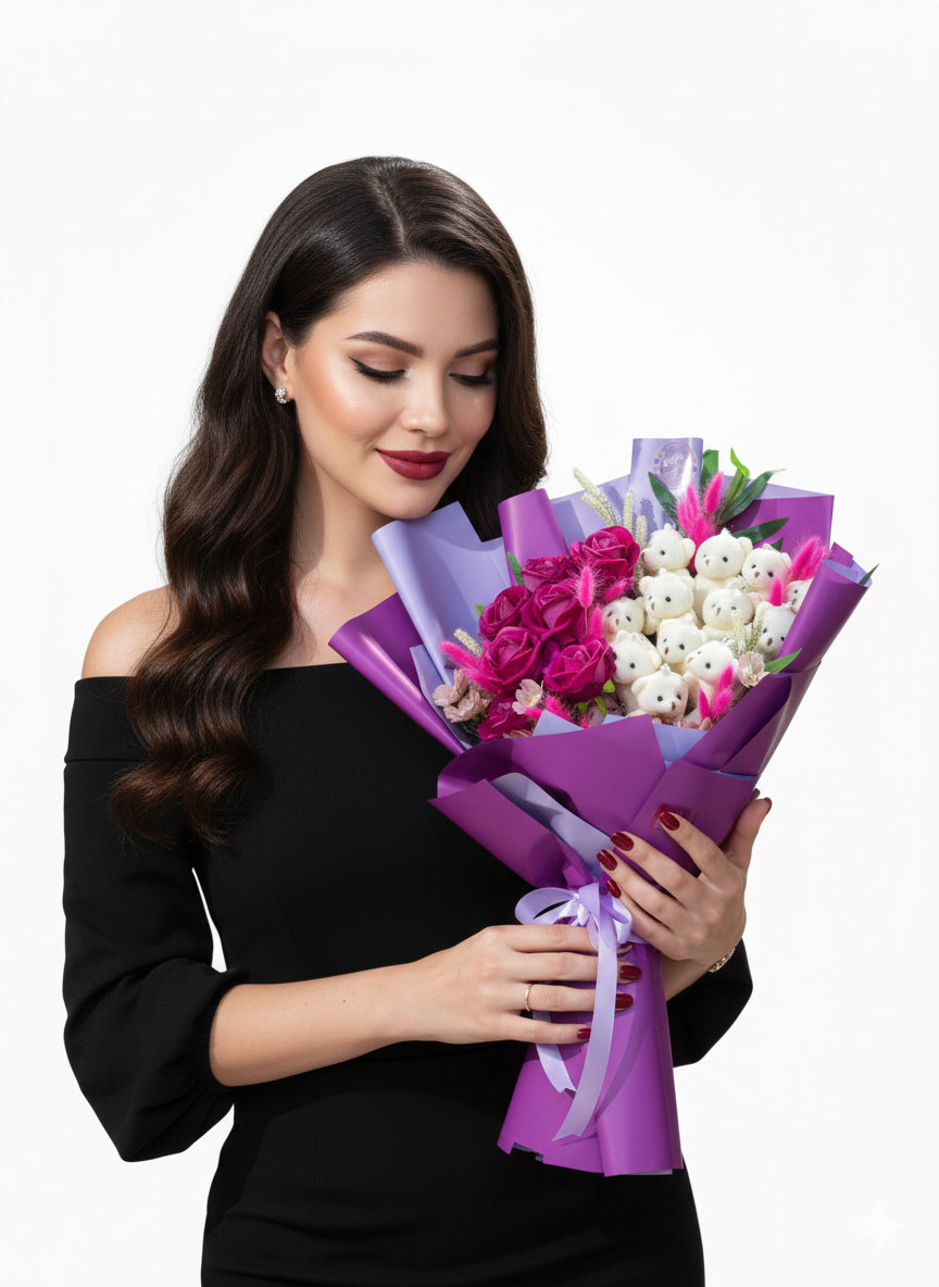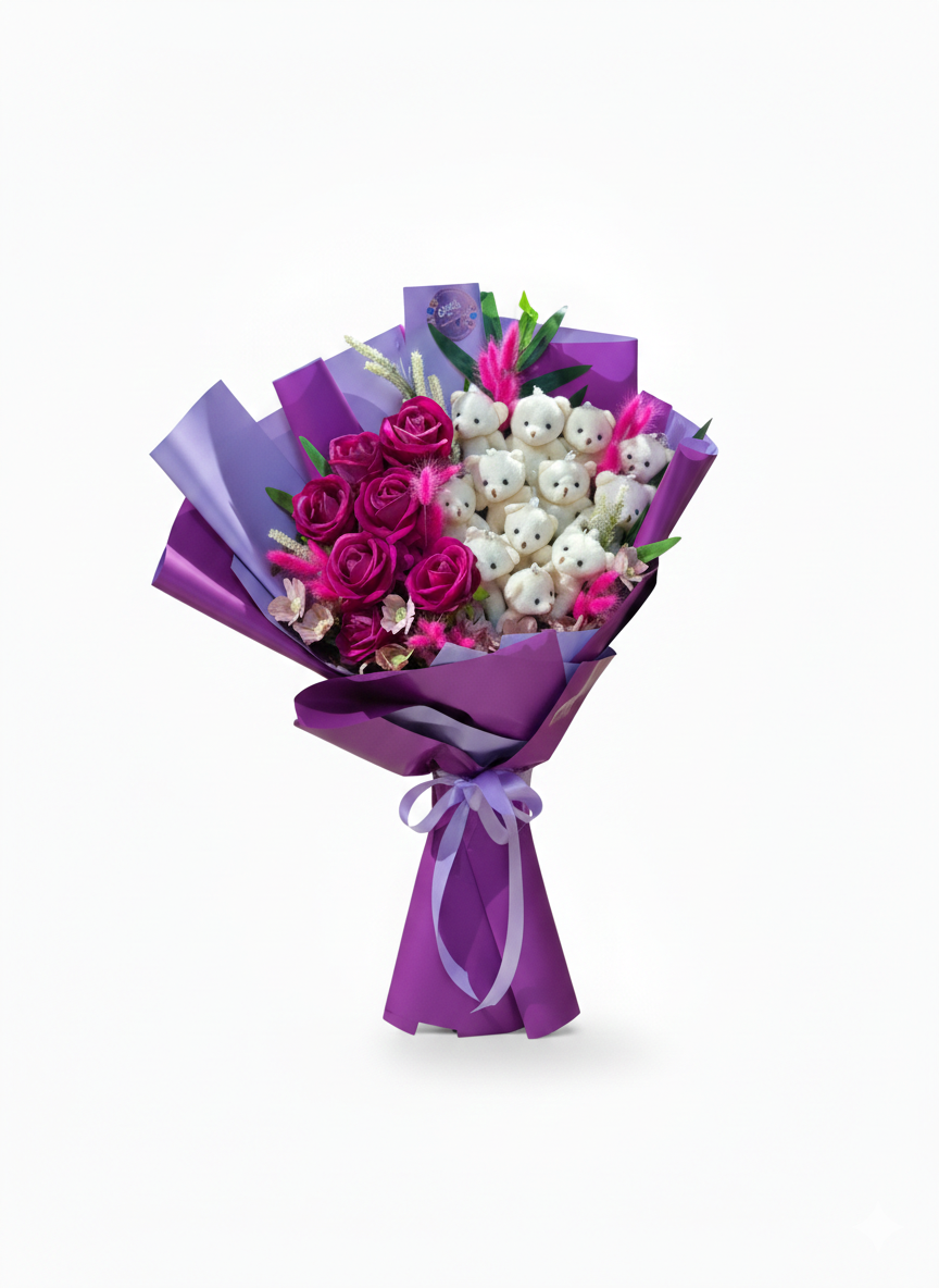 Zengin ve Katmanlı Tasarım: Canlı fuşya ve mor tonlarındaki güller ile saflığı simgeleyen beyaz peluş ayıcıkları bir araya getiren bu özel aranjman, Rose Art’ın modern tasarım anlayışını yansıtır.