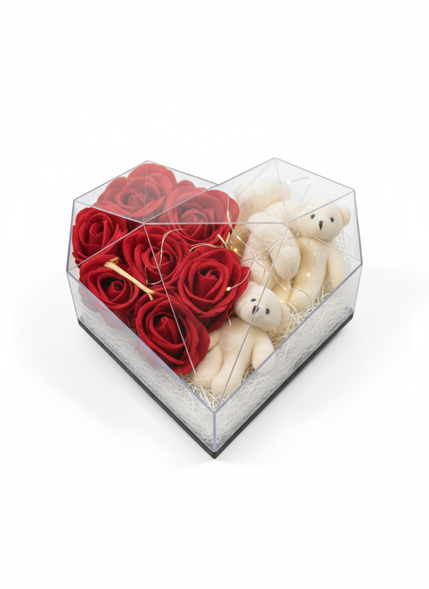 VIP Kristal Sunum: Kalp formundaki yüksek mukavemetli pleksi kutu, içindeki tasarımı dış etkenlerden korurken 360 derece görsel bir şölen sunar.