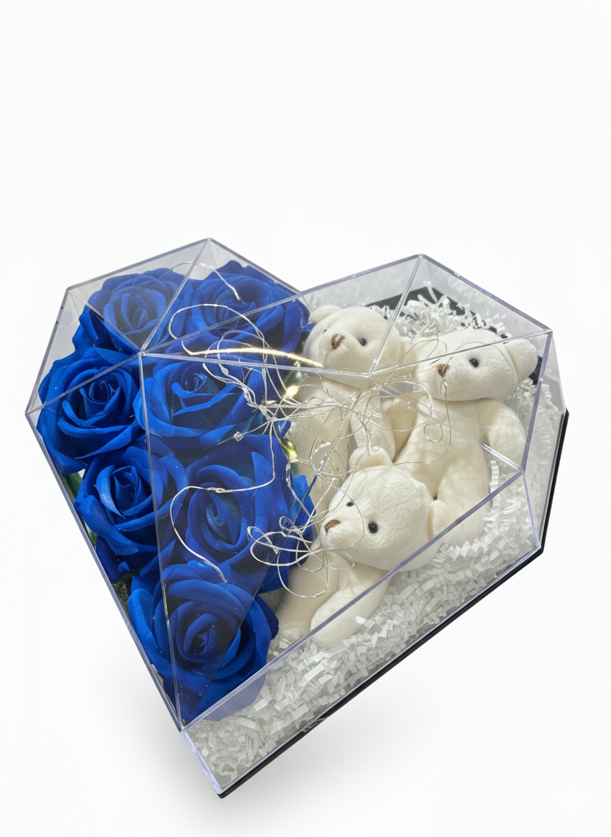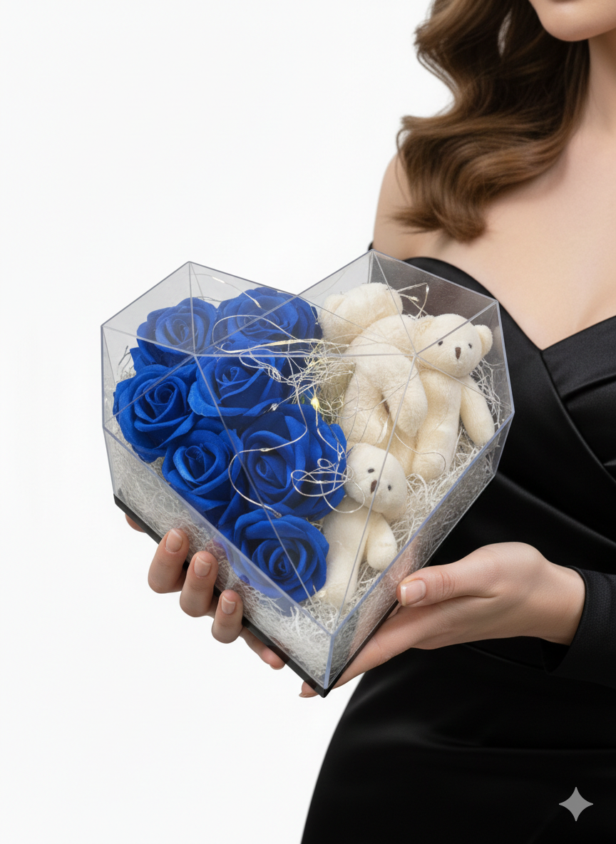 VIP Kristal Sunum: Kalp formundaki yüksek mukavemetli pleksi kutu, içindeki tasarımı dış etkenlerden korurken 360 derece görsel bir şölen sunar.