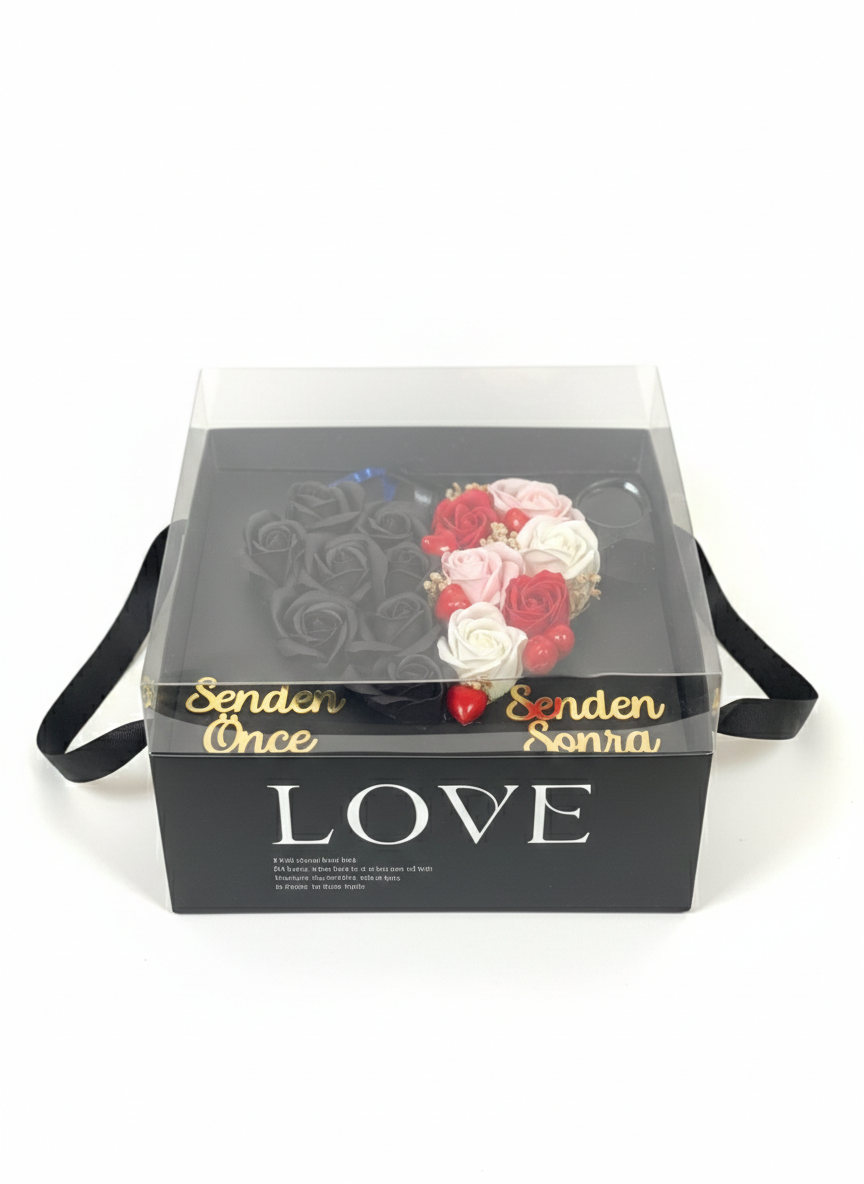 VIP Dekoratif Estetik: Mat siyah "LOVE" kutusu ve altın varaklı "Senden Önce & Senden Sonra" yazıları, Sevgililer Günü yemeğinde masanın en şık ve dikkat çekici detayı olur.