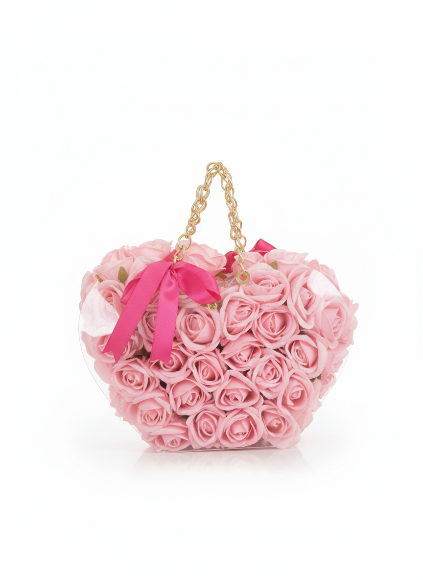 Özgün Tasarım: Şeffaf akrilik kalp formunda, modern çanta tasarımı ve şık gold zincir askısıyla sunulan eşsiz bir dekoratif aranjmandır.